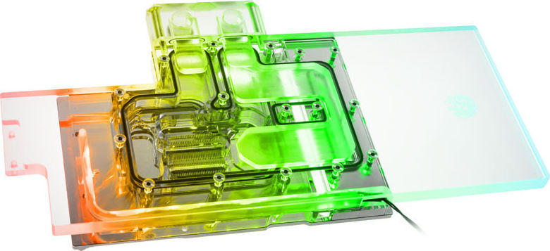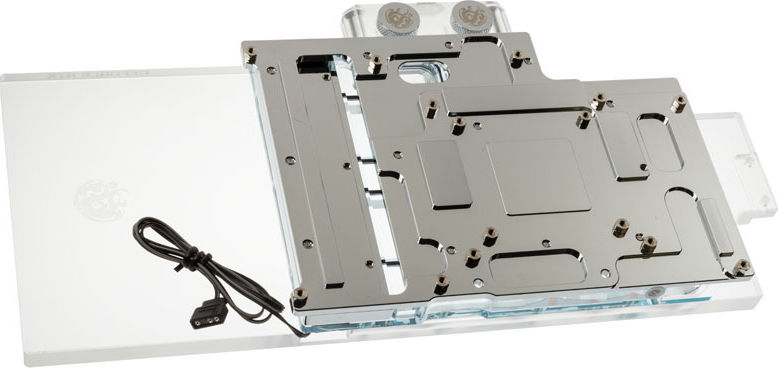 Es handelt sich um ein Full-Block-Design, welches alle relevanten Hitzequellen der Grafikkarte bedeckt und somit effektiv kühlt - also die GPU, den Speicher und die Spannungswandler. Dabei kommt vernickeltes und verchromtes Kupfer zum Einsatz, um die Wärme optimal zu übertragen.