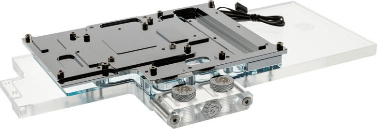 Der Deckel besteht aus transparentem Acryl-Glas, das von einem silbernen Cover geziert wird. Das Anschlussterminal verfügt über vier Bohrungen (G1/4-Zoll-Gewinde). Durch die flache Bauform des Kühlers ist auch die Verbindung mehrerer Grafikkarten in einem Verbund problemlos möglich.