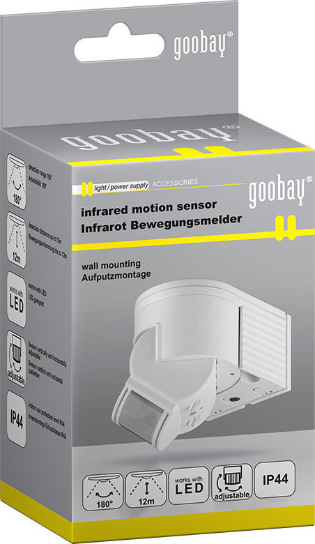 Goobay Infrarot Bewegungsmelder, Weiß, Hängbarer Karton - zur Aufputz-Wandmontage, 180° Erfassung, 12 m Reichweite, für Außen (IP44), LED-geeignet