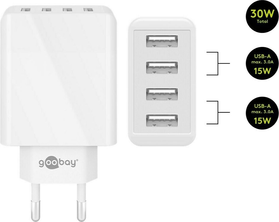 4-fach USB-Ladegerät 30W; 4-fach USB-Ladegerät 30W, Weiß - mit 4x USB-Buchse, flache Bauform