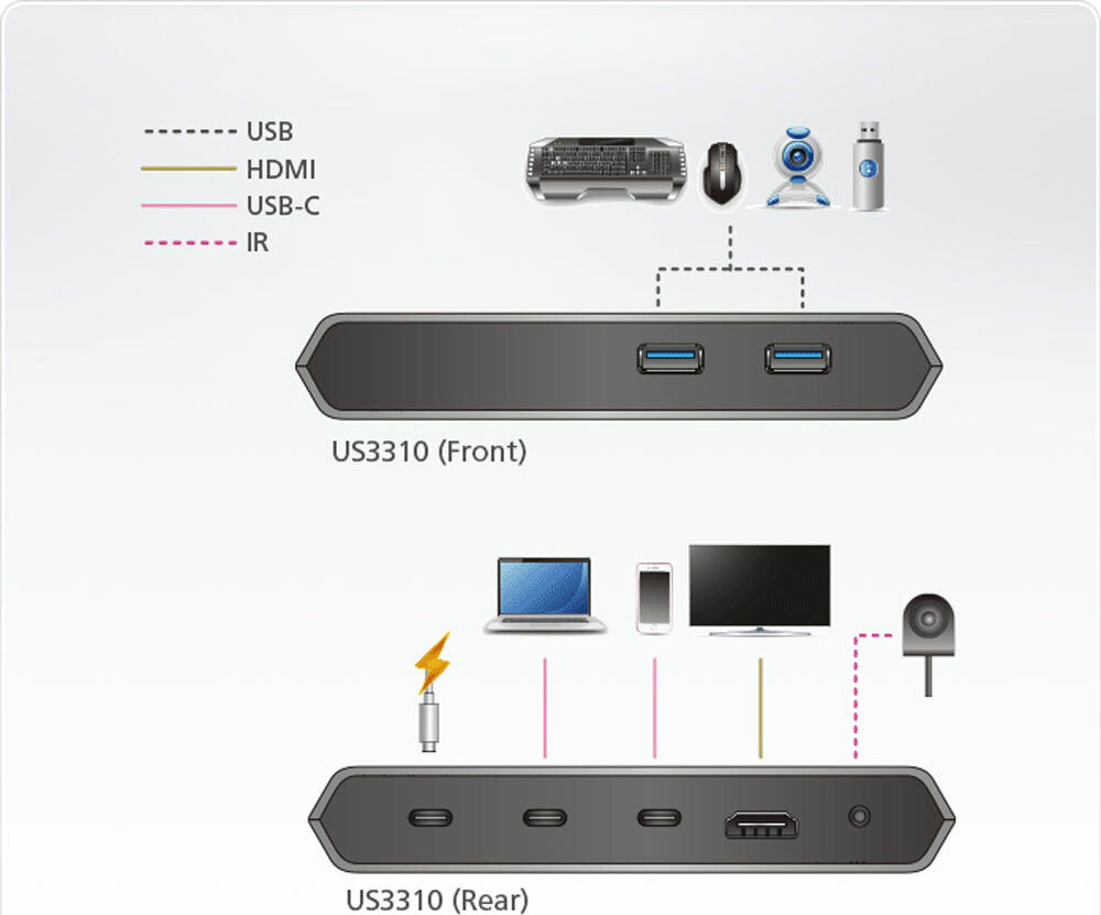 Erweitern Sie die Möglichkeiten Ihres Mobilgeräts Das Ein- und Ausstecken entfällt. Schließen Sie Ihr USB-C Smartphone, iPad Pro und Ihren Laptop oder zwei USB-C Laptops an den US3310 an und teilen Sie sich ein Display und Peripheriegeräte.* Verwenden Sie nur einen Bildschirm, Tastatur und Maus, um zwei Systeme nahtlos zu steuern und Platz zu sparen. Stellen Sie den Remote-Port-Wähler an die bequemste Stelle oder verstecken Sie ihn sogar unter Ihrem Schreibtisch, um schnell zu wechseln. Schnelle 2-Sekunden Umschaltung, um effizient zu bleiben Es bleibt keine Zeit zu verlieren, wenn es um die Umschaltung geht. Dank der exklusiven ATEN Technologie, die Verzögerungs- und Auflösungsprobleme eliminiert, dauert der Wechsel zwischen zwei Systemen nur zwei Sekunden und macht Ihren Workflow effizienter. Ihre HDMI Verbindung bleibt aktiv, ohne das Layout beim Umschalten zu unterbrechen. Der USB-Anschluss funktioniert wie ein USB-Hub, d.h. Sie können alle Funktionen einer Tastatur und Maus, wie z.B. Medientasten oder zusätzliche Maustasten, beibehalten. Erweitern Sie die Desktop Umgebung auf Ihr Telefon Heutzutage kann ein Smartphone wie ein PC funktionieren. Verwenden Sie Ihr Smartphone, um unterwegs zu arbeiten, zu schauen und zu spielen. Zurück im Büro oder zu Hause können Sie es mit dem US3310 verbinden, um eine Workstation im Samsung DeX Modus für Multitasking zu schaffen, und zu einem Laptop wechseln, sobald Sie anspruchsvolle Aufgaben zu erledigen haben. Laden Sie Ihr Telefon, iPad, Laptop und stromfressende Geräte auf 85W USB-C Power Delivery 3.0 Pass-Through lädt Ihr Telefon und Ihren Laptop gleichzeitig auf und bietet auch genügend Strom für stromhungrige Geräte wie externe Festplatten oder Spielgeräte. Sie können Ihre bevorzugte Tastatur und Maus verwenden, um zu arbeiten und zu spielen, sogar mit einem leistungshungrigem RGB Gaming-Rig. Der US3310, 2-Port USB-C Dock Switch mit Stromdurchgang verfügt über die Kombination aus einem Multi-Port Dock und ermöglicht das Umschalten zwischen zwei Quellen mit nur einer Taste – Laptop und Android Smartphone. Verwenden Sie nur einen Bildschirm, Tastatur und Maus, um zwei verschiedenen Systeme nahtlos zu steuern und Platz zu sparen. Mit dem Remote-Port-Wähler können Sie ihn an die bequemste Stelle stellen oder unter dem Schreibtisch verstecken, um den schnellen Wechsel vorzunehmen. Ausgestattet mit den überragenden HDMI-Videoauflösungen von bis zu 4K (3840 x 2160) bei 30Hz liefert der US3310 hochwertige Videos mit minimaler Latenz beim Umschalten und Ihre HDMI-Verbindung bleibt aktiv, ohne das Layout beim Umschalten zu zerstören. Darüber hinaus bietet USB 3.2 Gen1 eine Datenübertragungsgeschwindigkeit von bis zu 5 Gb/s, so dass externe Speichermedien für den Datenaustausch zwischen zwei Systemen problemlos gemeinsam genutzt werden können. 85 W USB-C Power Delivery 3.0 Pass-Through kann Ihr Telefon und Ihren Laptop weiterhin gleichzeitig aufladen und bietet auch genug Strom für stromhungrige Geräte, wie externe Festplatten oder Spielgeräte. Sie können das Smartphone mit dem US3310 verbinden, um eine Workstation im Samsung DeX Modus oder Huawei Desktop Modus für Multitasking zu schaffen, und zu einem Laptop wechseln, sobald Sie anspruchsvolle Aufgaben zu erledigen haben. Mit dem US3310 können Benutzer Platz auf dem Schreibtisch sparen, Hostgeräte direkt wechseln und eine personalisierte Desktop Umgebung einrichten. Ermöglicht es einem USB-C Laptop und einem Android Smartphone, einen HDMI-Monitor und alle angeschlossenen USB-Peripheriegeräte* gemeinsam zu nutzen Bietet USB Power Delivery 3.0 für das Laden von Laptops bis zu 85 W (zusätzliches USB-C Netzteil erforderlich)** Unterstützt 4K Videoauflösungen – bis zu 3840 x 2160 bei 30 Hz Unterstützt Samsung DeX oder Huawei Desktop Modus*** Video D