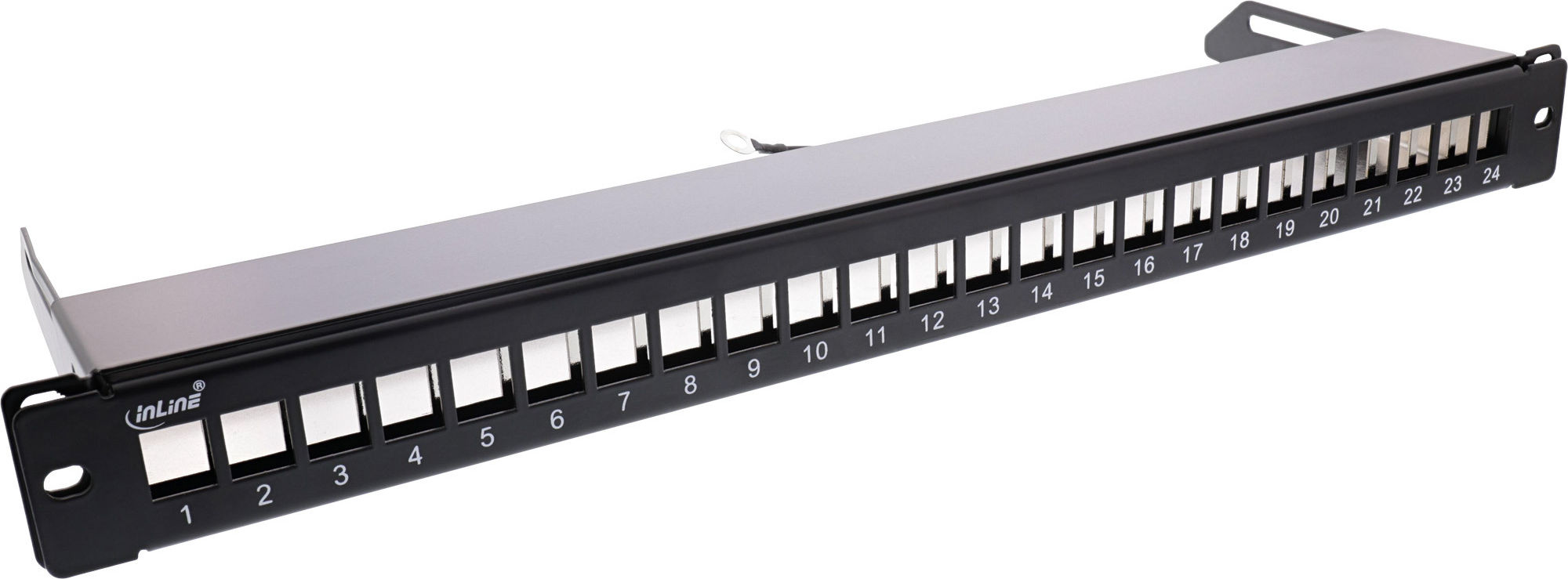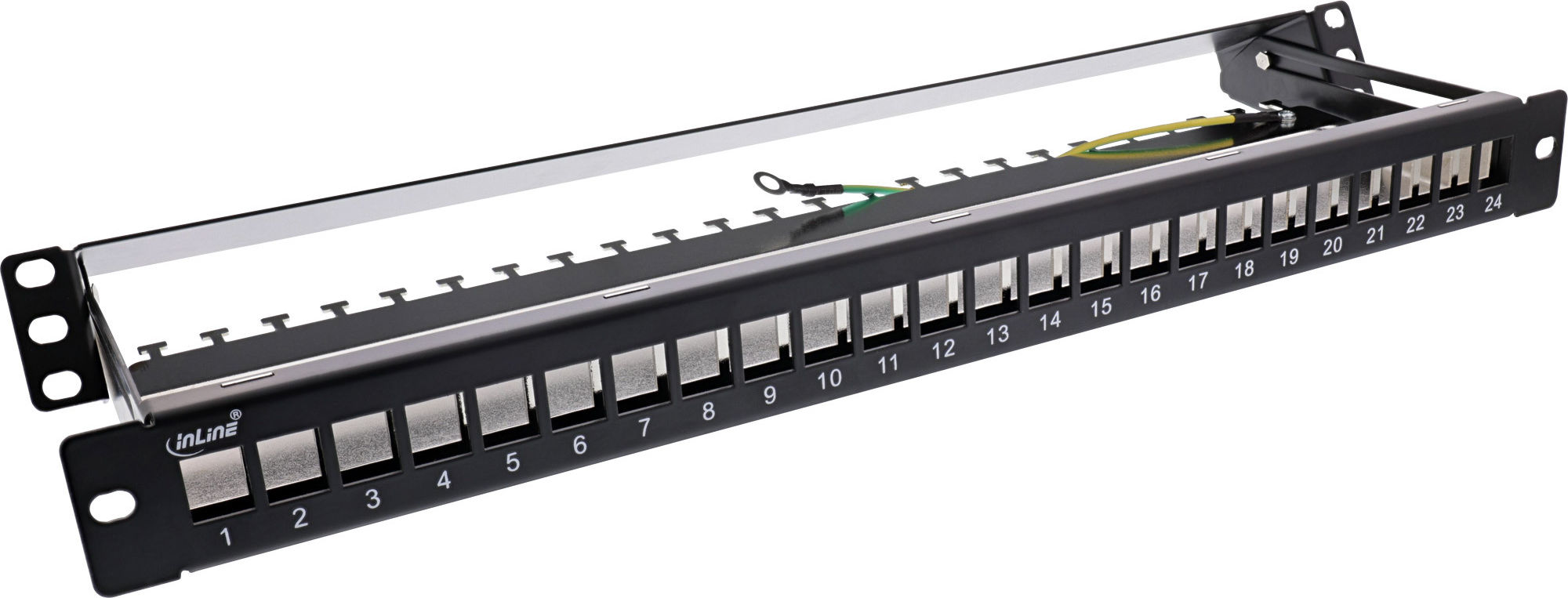 Patchfeld Leerblech zur Verwendung mit Snap-In Modulen geeignet für Cat.6A, Cat.6, Cat.5 Module für max. 24 Keystone Module 19" Rahmen, Höhe: 1HE Farbe schwarzPatchpanel zur Aufnahme von Buchsen-zu-Buchsen-Durchgangsschnittstellenmodulen mit Snap-In-Schnelltrenntechnik. Ideal zum Gruppieren und Verbinden verschiedener Abschnitte einer logisch strukturierten Verkabelung.