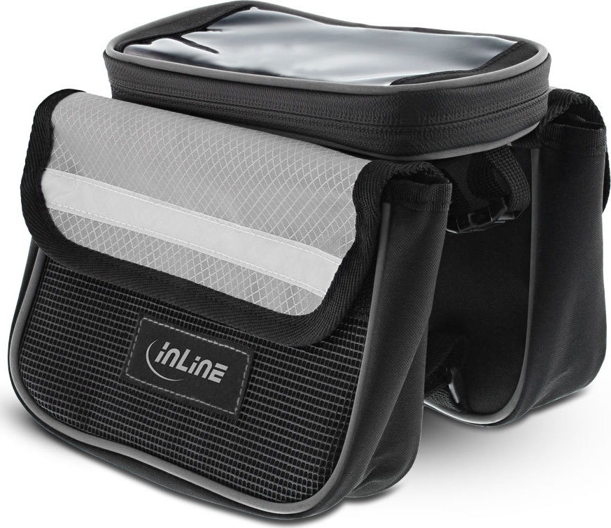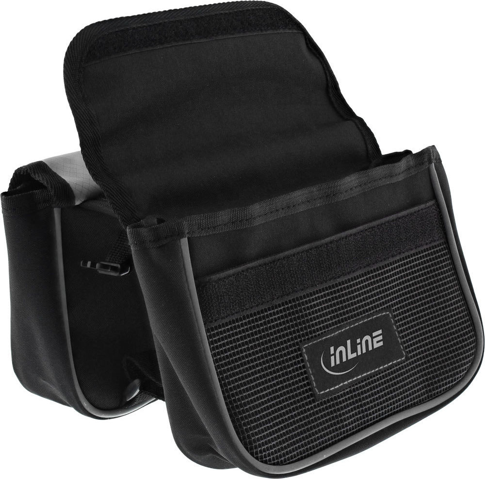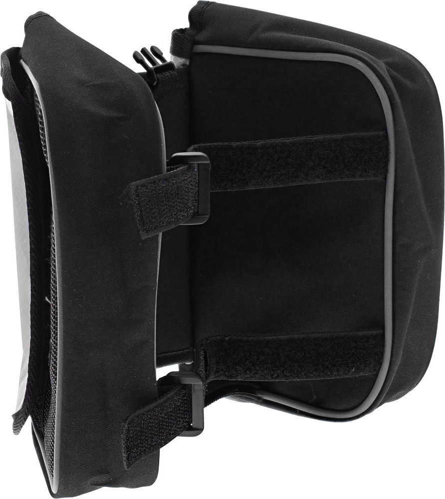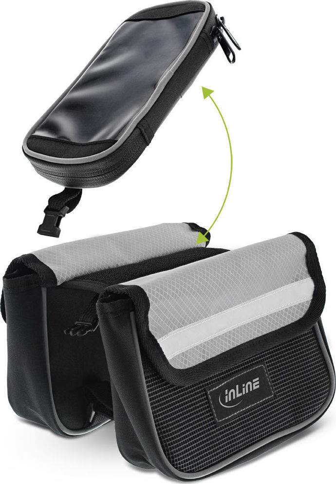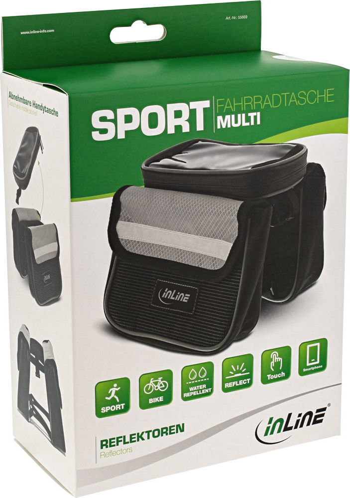 Diese Rahmentasche kann auf jedem Fahrrad schnell und einfach durch Klettverschlüsse befestigt werden. Sie besteht aus wasserabweisendem Oxford-Nylon und besitzt insgesamt drei Taschen, zwei davon sind seitlich angebracht und ideal geeignet für Ihre Geldbörse oder ein kleines Notfallset. Die dritte Tasche besitzt ein Sichtfenster mit Touchscreen-Support für Ihr Smartphone und ermöglicht Ihnen dadurch eine einfache und sichere Bedienung Ihres Smartphones, ohne es aus der Tasche nehmen zu müssen. Zusätzlich lässt sich die Smartphone-Tasche von der Fahrradtasche entfernen und separat nutzen. Material: Oxford-Nylon Smartphone-Tasche: 17x9x1,7cm 2 Seitentaschen: 16x11x4cm WasserabweisendDiese Rahmentasche kann auf jedem Fahrrad schnell und einfach durch Klettverschlüsse befestigt werden.Sie besteht aus wasserabweisendem Oxford-Nylon und besitzt insgesamt drei Taschen, zwei davon sind seitlich angebracht und ideal geeignet für Ihre Geldbörse oder ein kleines Notfallset. Die dritte Tasche besitzt ein Sichtfenster mit Touchscreen-Support für Ihr Smartphone und ermöglicht Ihnen dadurch eine einfache und sichere Bedienung Ihres Smartphones, ohne es aus der Tasche nehmen zu müssen.Zusätzlich lässt sich die Smartphone-Tasche von der Fahrradtasche entfernen und separat nutzen.