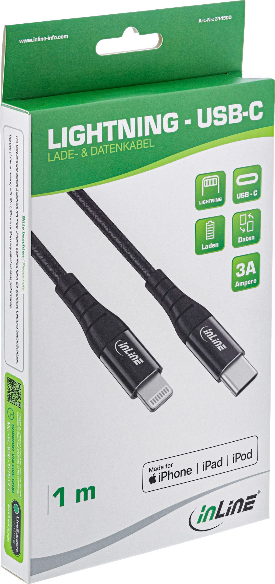 Dieses USB Kabel verbindet iPhone, iPad oder iPod über den Lightning Stecker mit dem USB-C Anschluss des Computers. Synchronisieren oder laden Sie Ihr Gerät mithilfe dieses Kabels über den USB-C Zugang Ihres Computers oder einem Netzadapter. Zeitgleiches Synchronisieren der Daten und Aufladen Ihres iPhone / iPad / iPad Zum Verbinden ihres iPhone / iPad / iPad mit dem PC oder Mac Kompatibel mit den folgenden Apple Modellen mit Lightning Anschluss: iPhone 14 Pro, iPhone 14 Pro Max, iPhone 14 Plus, iPhone 14, iPhone 13 Pro, iPhone 13 Pro Max, iPhone 13 mini, iPhone 13, iPhone 12 Pro, iPhone 12 Pro Max, iPhone 12 mini, iPhone 12, iPhone 11 Pro, iPhone 11 Pro Max, iPhone 11, iPhone SE (2. Generation), iPhone XS, iPhone XS Max, iPhone XR, iPhone X, iPhone 8 Plus, iPhone 8, iPhone 7 Plus, iPhone 7, iPhone SE, iPhone 6s Plus, iPhone 6s, iPhone 6 Plus, iPhone 6, iPhone 5s, iPhone 5c, iPhone 5, iPad mini (6. Generation), iPad (9. Generation), 12,9" iPad Pro (2. Generation), 12,9" iPad Pro (1. Generation), 10,5" iPad Pro, 9,7" iPad Pro, iPad Air (3. Generation), iPad Air 2, iPad Air (1. Generation), iPad (8. Generation), iPad (7. Generation), iPad (6. Generation), iPad (5. Generation), iPad mini (5. Generation), iPad mini 4, iPad mini 3, iPod touch (7. Generation), iPod touch 6. Generation, iPod touch 5. Generation, iPod nano 7. Generation, AirPods Max, AirPods Pro, AirPods mit kabellosem Ladecase (2. Generation), AirPods mit Ladecase (2. Generation), AirPods (1. Generation), Kabelloses Ladecase für AirPods und neuere Modelle USB-C Stecker auf Lightning Stecker Lizenziertes MFi Anschlusskabel Farbe: schwarz/Aluminium Kabel mit Textilummantelung Unterstützt das schnelle Aufladen mit bis zu 18W, USB-Power-Delivery (USB-PD) kompatibel Länge: 1m iPad, iPhone, iPod, iPod classic, iPod nano, iPod shuffle and iPod touch sind Marken der Apple Inc., registriert in USA und anderen Staaten.Dieses USB Kabel verbindet iPhone, iPad oder iPod über den Lightning Stecker mit dem USB-C Anschluss des Computers. Synchronisieren oder laden Sie Ihr Gerät mithilfe dieses Kabels über den USB-C Zugang Ihres Computers oder einem Netzadapter.